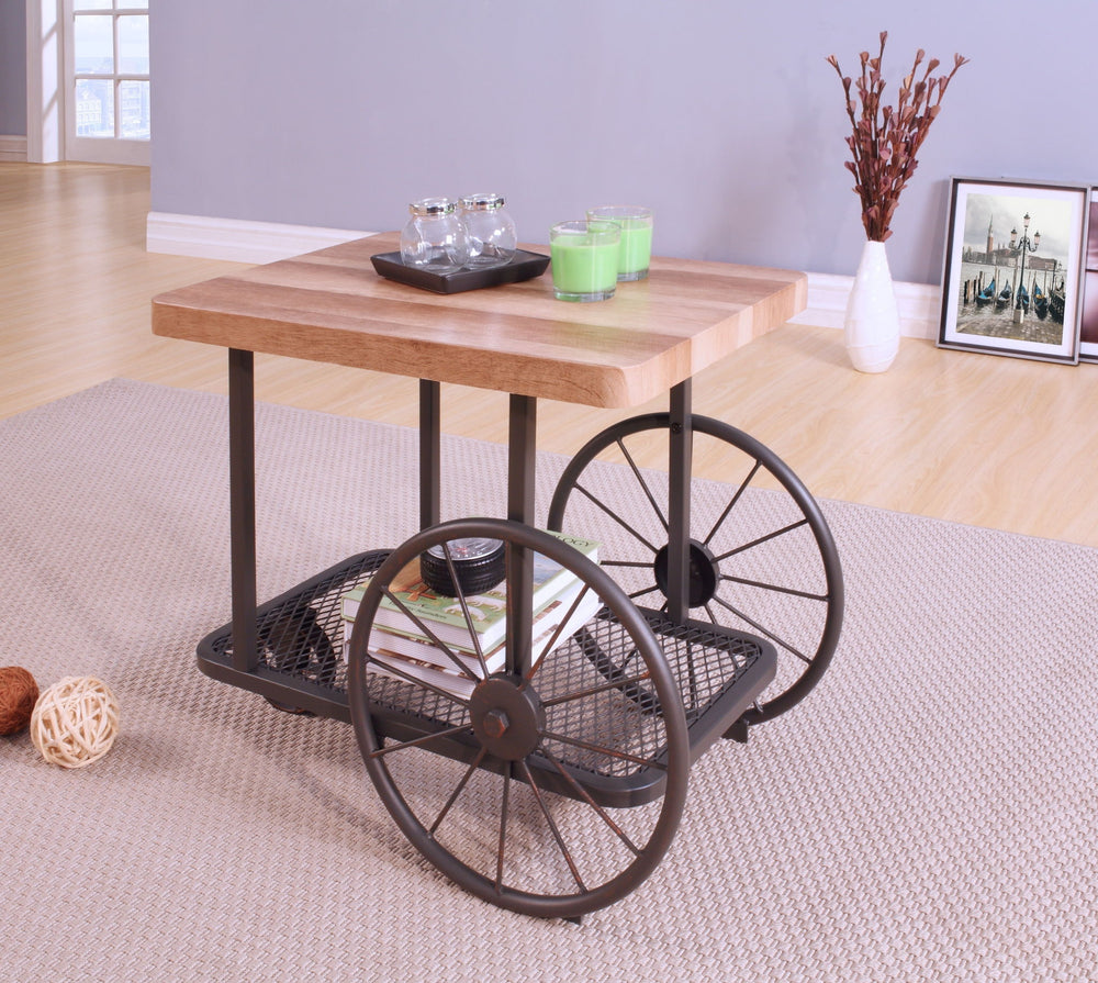 Industrial Aesthetic: Equipped with industrial-style metal wheels in an antique sand and bronze hand-painted finish, the table adds functionality and a worn-in aesthetic.