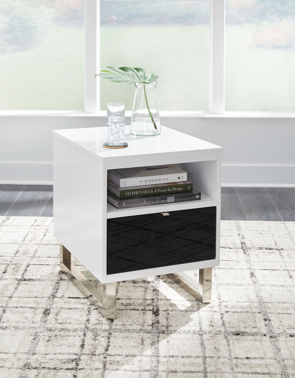 Combining a high-gloss white finish with a black drawer front, this chairside end table proves opposites really do attract. It's the perfect blend of modern style and functionality, with plenty of space for essentials and convenient USB charging. What a smart choice on so many levels.