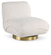 Have a seat and get cozy with this Geneva swivel chair that's upholstered in rich boucle fabric. Its padded seat makes it ultra-comfortable, and its solid wood frame provides ample lumbar support. Its brushed gold metal base adds a dash of complementary color, and its swivel chair design makes it a fun piece to relax on. This contemporary accent chair is the perfect addition for any modern living space, and is sure to draw eyes when you have guests visiting.