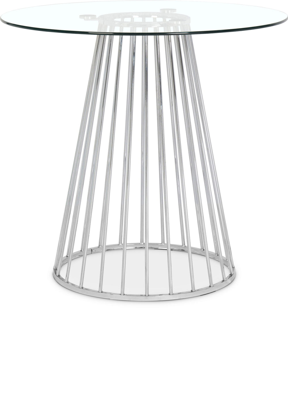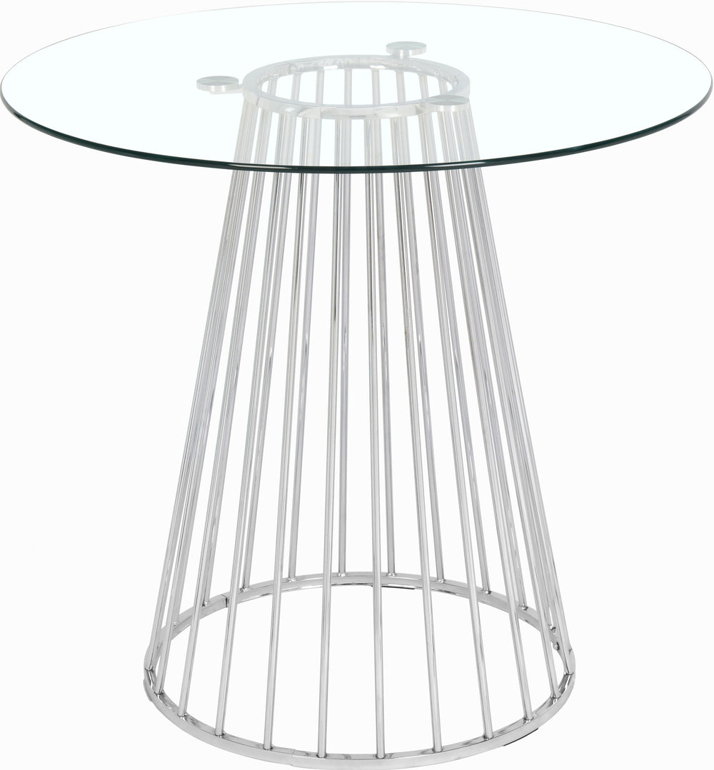 Add a bold touch to your dining area with this chic Gio counter height table. Featuring a round, clear tempered glass tabletop and a polished metal base with a wired contemporary design, this dining table transforms your dining space into a stylish haven.