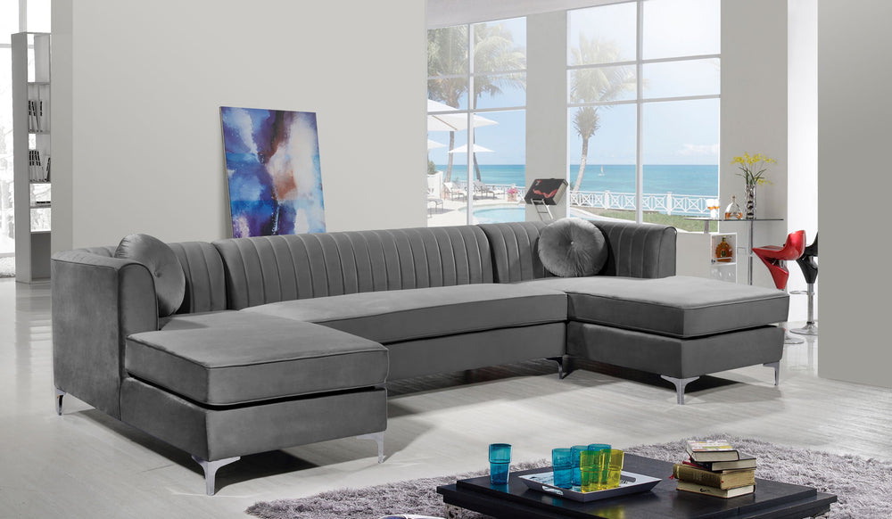 Sit back and get comfy on this velvet Graham sectional sofa. Plush velvet with a channel tufted back creates a contemporary display that is sure to be the focal point of your living room. This sectional comes with complete sets of and legs, so you can customize it to suit your existing decor.