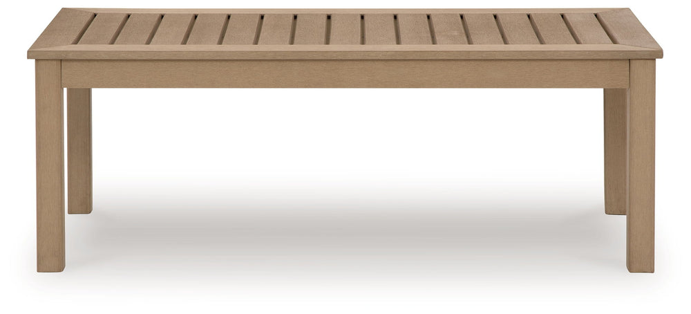 This coffee table is a beautiful addition to any outdoor living space. Effortless in its simplicity, this piece echoes your easygoing sensibilities. Combining durable, cutting-edge engineered materials, its Weatherwood construction in a blond wood color enhances the contemporary design. Pair this table with the matching sofa and chairs for a spectacular backyard or patio seating arrangement.