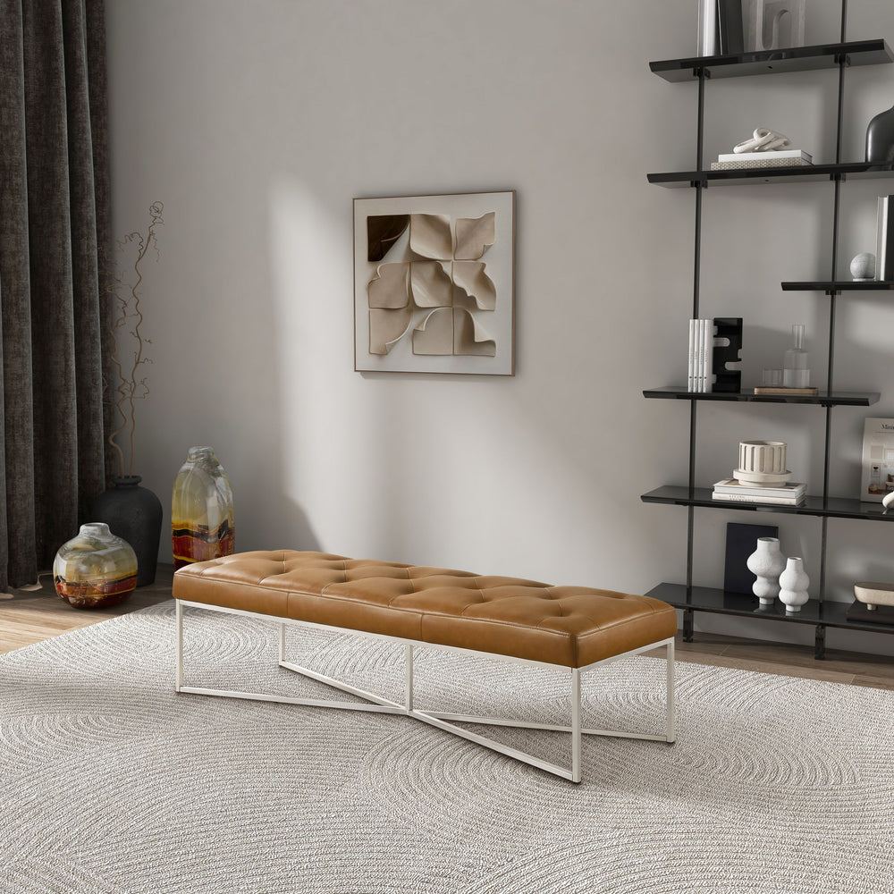 Premium Upholstery: The Harper Tan Leather Bench is upholstered in full grain leather with buttons, offering a...