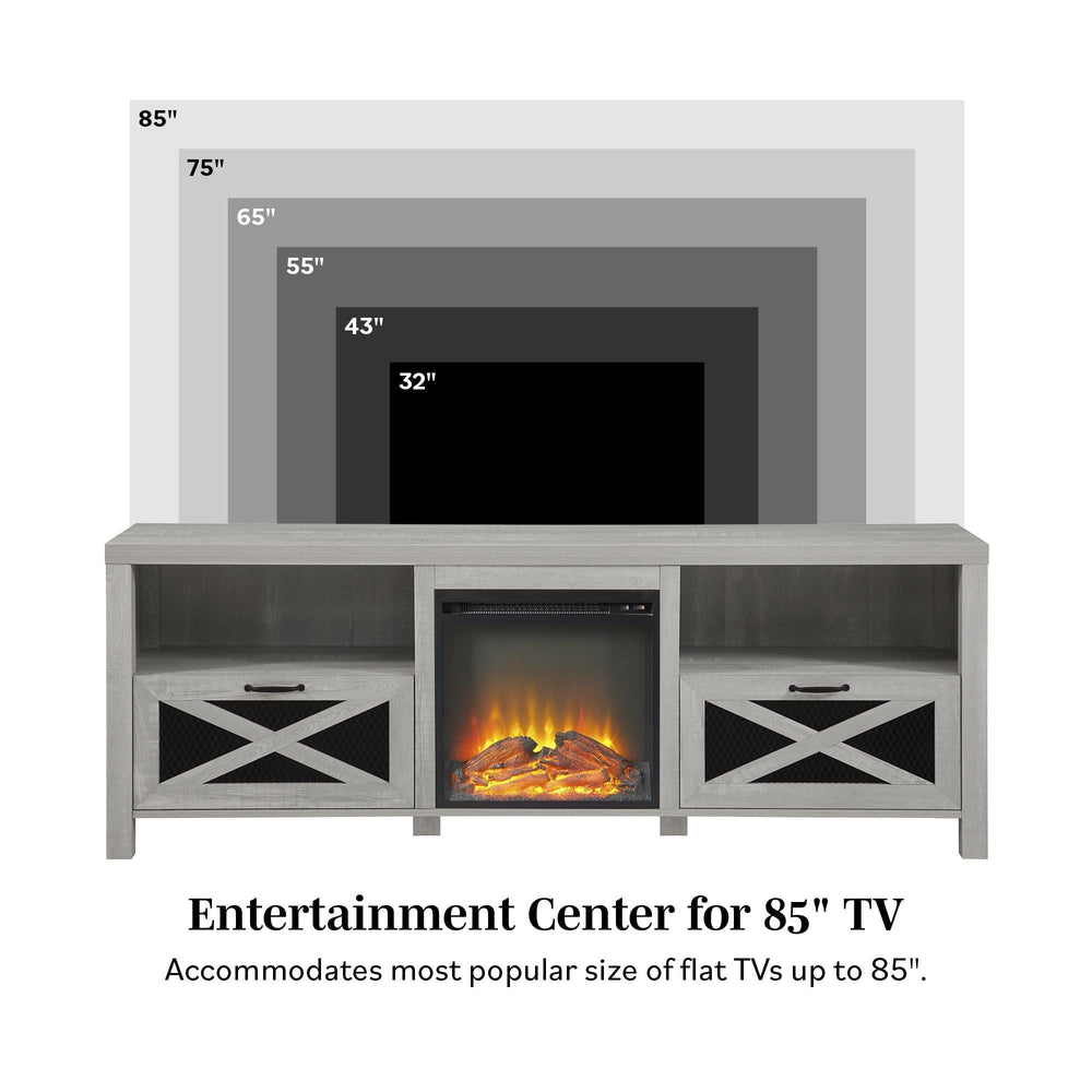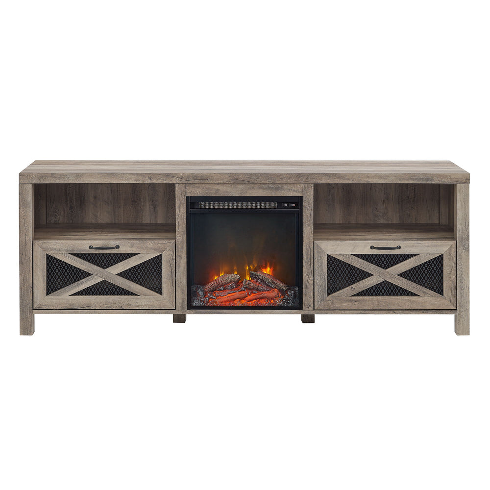 Industrial Farmhouse Metal Mesh Drop Down X Door 70" Fireplace TV Stand For 80" TVs - Gray Wash 70.0"W x 16.0"D x 25.0"H - 103.0 lb