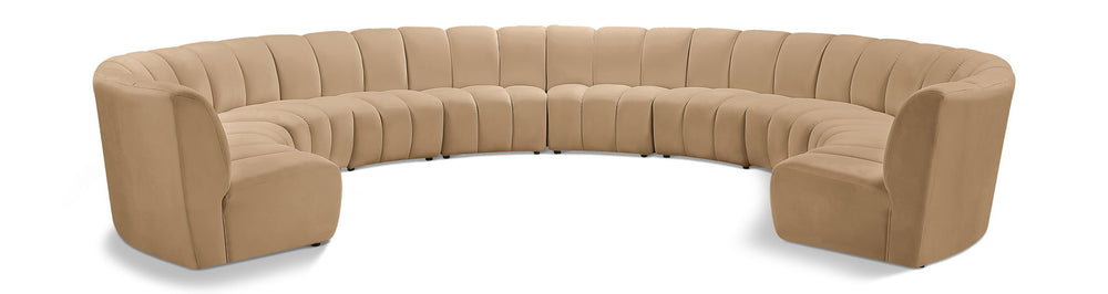 Create a seating group that works for every possible situation with this Infinity 10-piece sectional and other pieces in the Infinity collection. Upholstered in soft Camel velvet material that feels great against the skin and offers long-wearing beauty, this piece fits with other Infinity items for an infinite number of combinations that get your seating requirements just right but that look just as nice when used on their own.