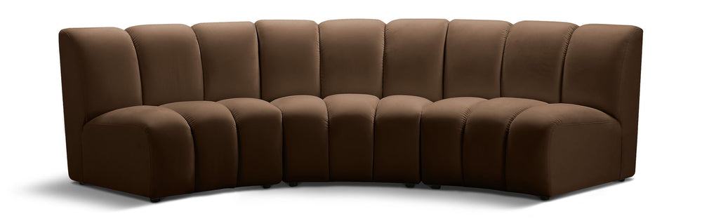 Create a seating group that works for every possible situation with this Infinity modular sofa and other pieces in the Infinity collection. Upholstered in soft Brown velvet material that feels great against the skin and offers long-wearing beauty, this piece fits with other Infinity items for an infinite number of combinations that get your seating requirements just right but that look just as nice when used on their own.