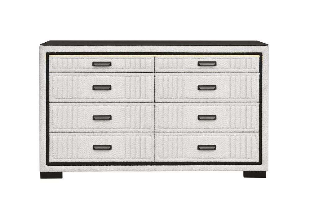Wrapped in white upholstery with fluted drawer fronts for a soft yet structured look, the Isabella Dresser features LED lighting to create a serene, modern glow. Spacious drawers offer practical storage, while the luxe finish and contemporary details make it a standout in any bedroom.