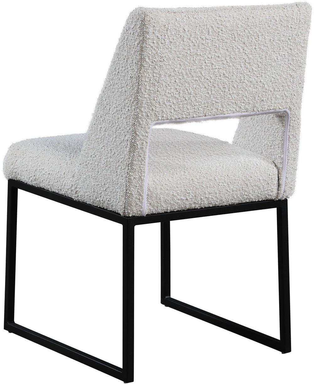 Give your dining area a contemporary makeover with this Jayce cream boucle fabric dining chair. Featuring a matte iron base and rich boucle fabric, this dining chair is both sturdy and cozy. Its contemporary design is ideal for any modern home, and its neutral color matches any color dining table. Its plush boucle upholstery provides you with a comfortable pace to sit, and its open rectangular back is stylish while adding spine support.
