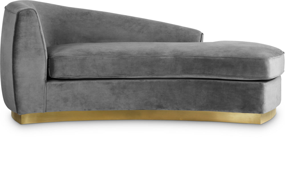 The perfect mix of velvet and stainless steel comes to life in your space with this Julian Chaise. This bold velvet chaise comes upholstered in rich, sumptuous-to-the-touch velvet to make a fashionable statement in your space. The curved back design lends it a modish touch, and the stainless steel trim around its base adds to its glitzy appeal. Stage this chaise alone or with other pieces in the Julian collection.