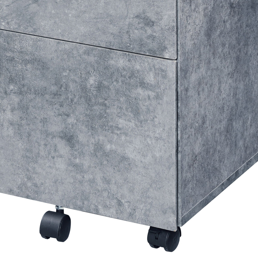 Design & Construction: The Jurgen Faux Concrete & Silver Finish File Cabinet features a wooden case-frame with a faux concrete veneer finish. It is constructed using materials like T18mm MDF, T15mm PB, and T12mm PB, ensuring durability and a sophisticated appearance.