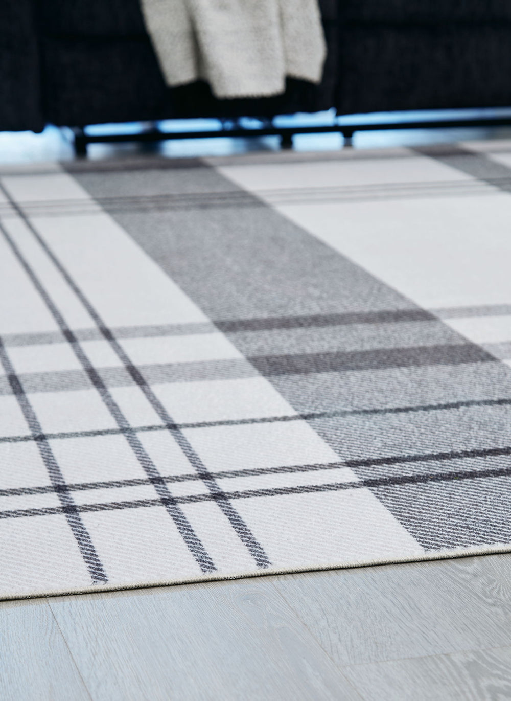 A fresh take on iconic plaid, this accent rug is both classic and contemporary. Its plaid design, with shades of gray crisscrossing against a solid cream background, has subtle variations that offer an artisanal feel. In addition, the machine woven material is durable and super soft underfoot.