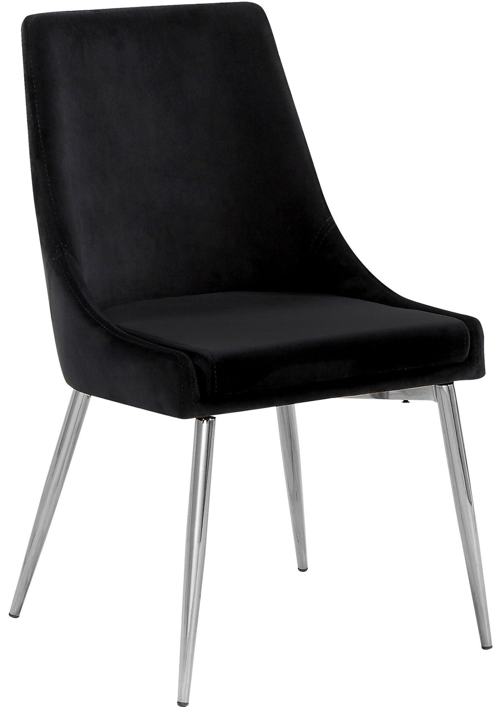 Extend contemporary panache to the dining room with this Karina Dining Chair. This dining chair features upholstery in sleek velvet for a modern look and has an armless design for a retro-inspired vibe. The stark color makes it easy to blend in with your existing decor colors or make a contrasting statement with ease. The slanted legs of this chair are finished for added modernity and to provide reliable and durable support while you dine.