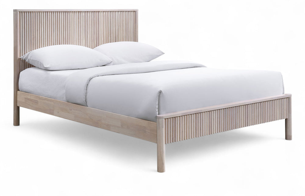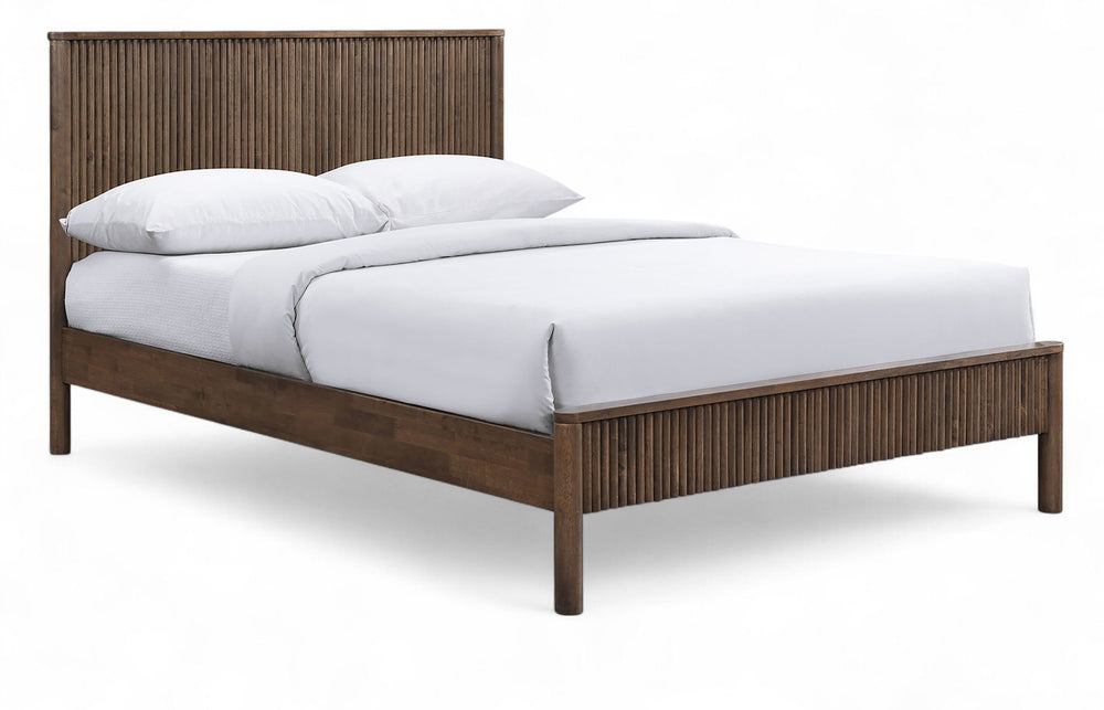 The sturdy Kivo solid wood bed in a rich finish brings timeless warmth to your bedroom. Vertical slatted detailing across the headboard and footboard adds a striking mid-century touch while keeping the look clean and modern. Built from solid wood, this piece blends durability with understated sophistication for a bed that anchors the room with style.
