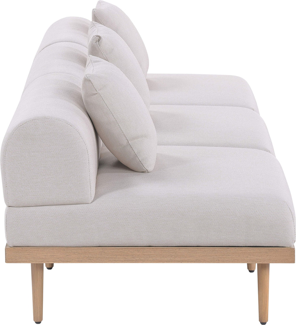 Sleek lines and soft water-resistant fabric bring contemporary style to the Laguna outdoor patio modular sofa. Crafted with a natural teak finish aluminum frame and quick-dry foam, it's built for ultimate outdoor relaxation. Rearrange or add to the set for endless configurations, creating a versatile lounging experience tailored to your space.