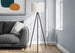 Contemporary Design: Eye-catching 63"h floor lamp with a metal tripod design and elegant linen drum shade, perfect for illuminating a corner of a room.