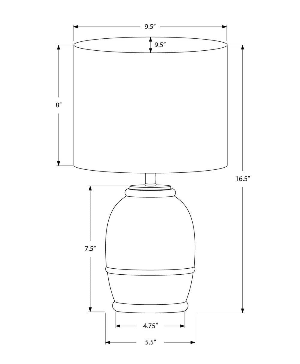 Dimensions: Measures 9.5 in. L x 9.5 in. W x 16.5 in. H, with a base of 5.5 in. L x 5.5 in. W x 7.5 in. H and a beige shade of 9.5 in. L x 9.5 in. W x 8 in. H.