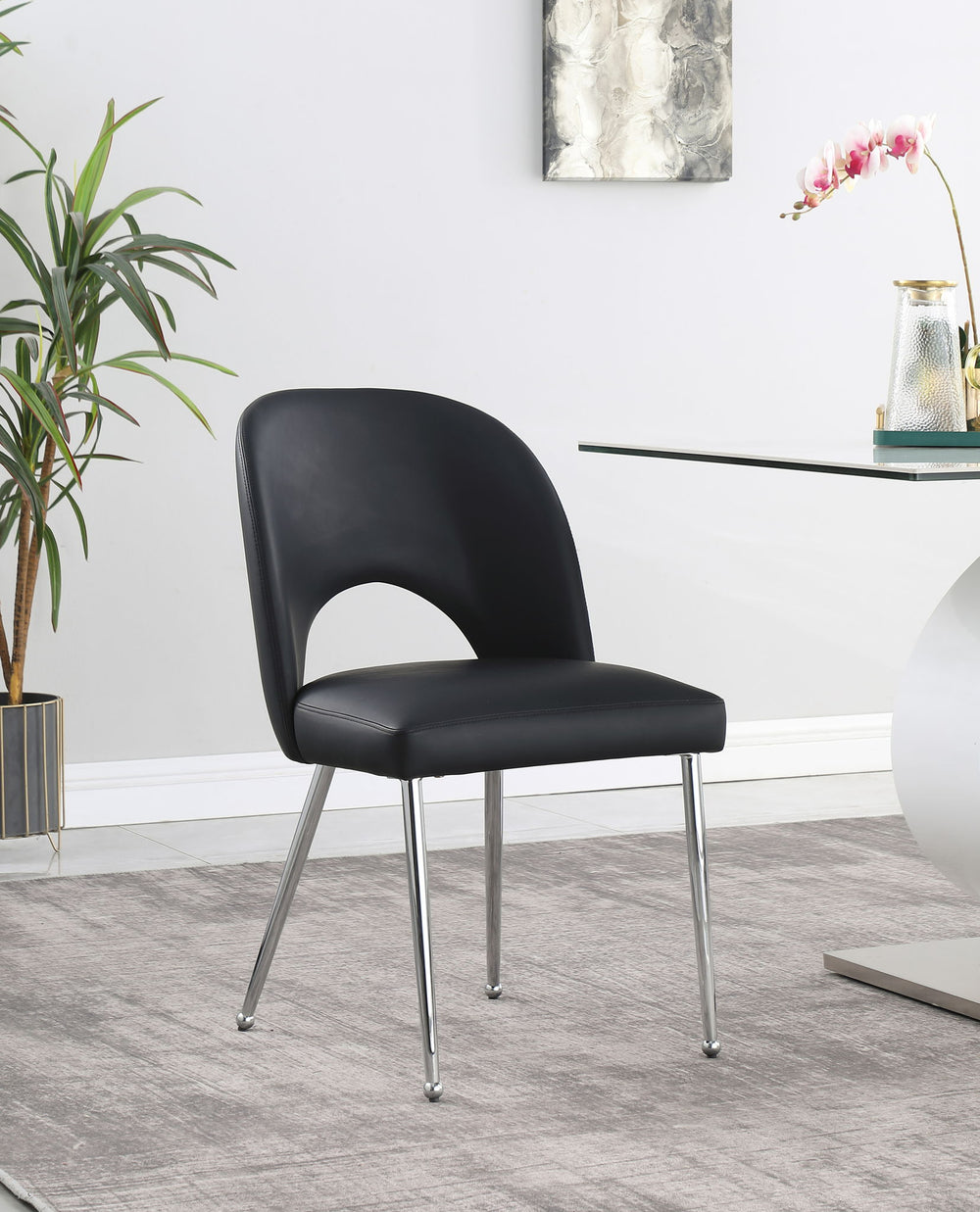 Give your dining area a modern makeover with this Logan faux leather dining chair. Featuring soft faux leather upholstery, this dining chair is both luxurious and comfortable. Its rich finish complements its seat and backrest, making it the perfect addition for any contemporary home. Its unique curved, open-back backrest provides ample physical support for your spine, and its plush seat cushion provides a cozy place to sit. This chair is just the right height to sit at any dining table or breakfast bar.