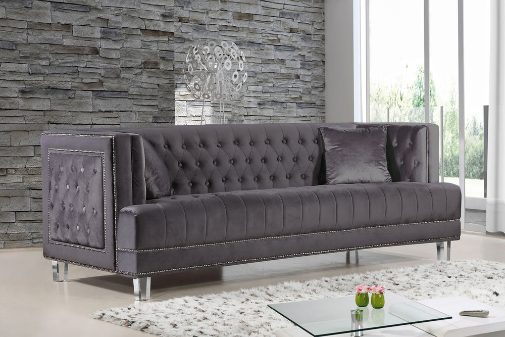 The Lucas Collection by Meridian Furniture. Features beautifully tufted velvet upholstery with a custom nail head design and clear acrylic legs. This collection is guaranteed to be the highlight of any home.