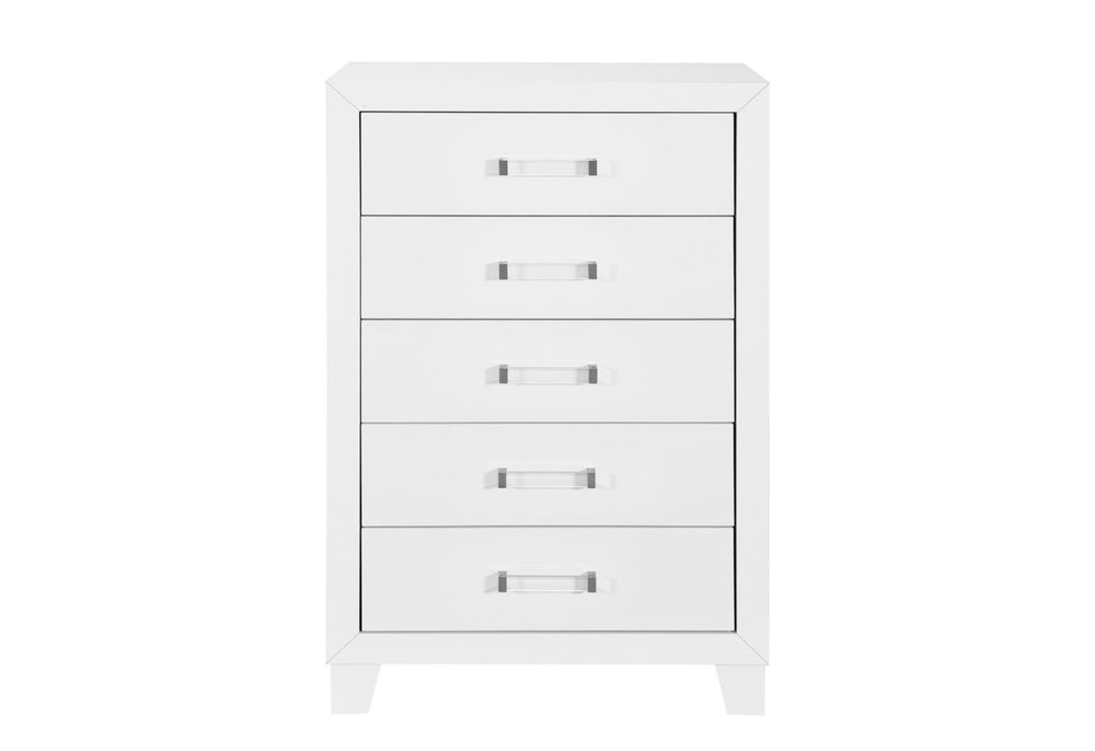 The Luccia 5-Drawer Chest is the epitome of form meeting function in bedroom design. Standing tall with a sleek white finish, this chest is a testament to Global Furniture USA's commitment to elegance and quality. Five drawers offer ample storage, making it an ideal choice for rooms where space is at a premium. The chest is accented with chic acrylic hardware which not only highlights the beauty of the piece but also offers a serene atmosphere. With its clean lines and refined presence, the Luccia 5-Drawer Chest is a perfect addition to any contemporary bedroom setting.