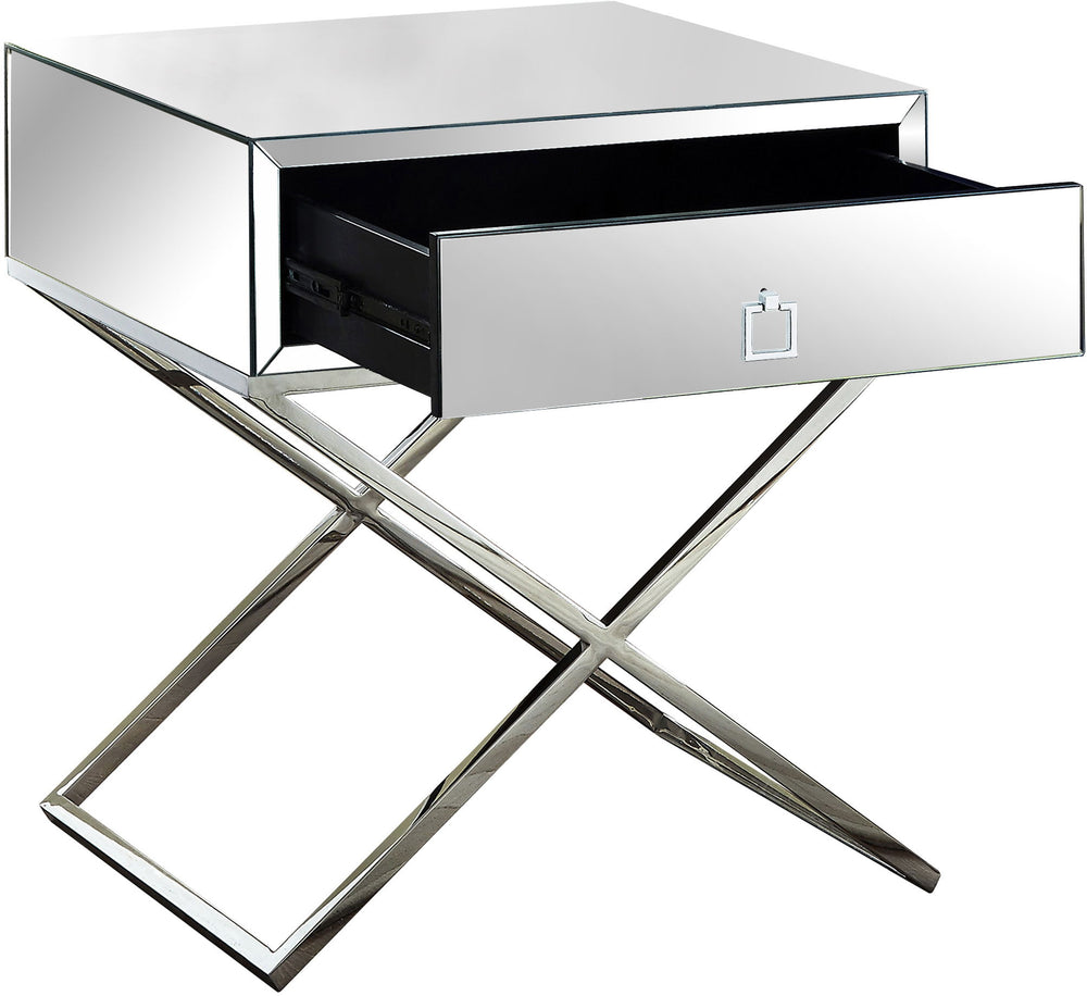 Get organized while keeping your room's details on point with this Lynn mirrored side table. This pretty side table features a single drawer for holding everything from remotes to reading material. The X-style legs add a modern aesthetic, and their chromed finish adds sparkle and shine to the design. A mirrored finish completes the look, ensuring this table fits well in modern decor themes.