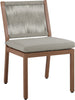 Make your outdoor oasis even more inviting with this Maui Outdoor Patio Dining Side Chair. Crafted with an aluminum frame to look like teak without the maintenance requirements, this dining side chair offers both style and convenience. Its resilient fabric cushions are water-resistant and plump and have quick-dry foam inserts. With its contemporary resort look, this chair adds sophistication to any patio, porch, or deck setting. Embrace the essence of outdoor comfort and style with this elegant addition - your perfect companion for leisurely moments outdoors.