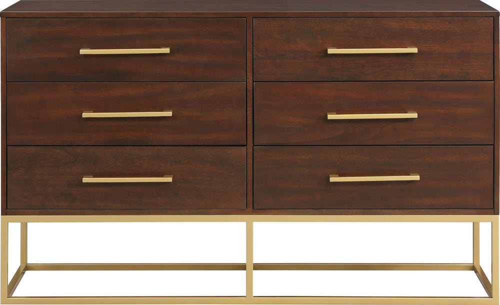 Inject bold, modern styling into your bedroom with this Maxine dresser. The dresser's contemporary design is nothing short of stunning, with unassuming lines and eye-grabbing hardware. A rich finish is modish and up-to-the-minute, while the brushed metal legs and drawer handles give this unit added flair. A metal base raises the dresser from the floor for a noticeably upscale vibe. Fill this dresser's drawers with essentials for keeping your bedroom space clean and neat.