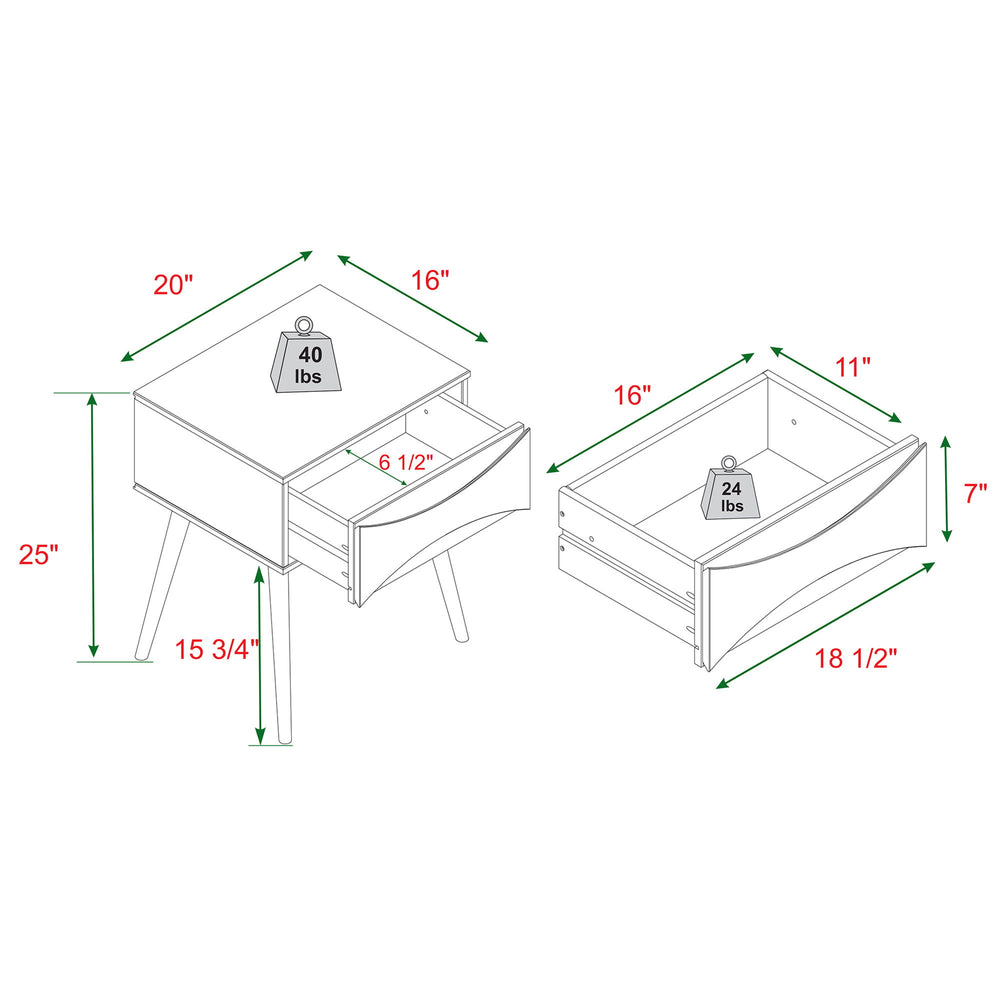 Mid-Century Modern 1 Drawer Solid Wood Nightstand - Walnut 20.0"W x 16.0"D x 25.0"H - 20.0 lb