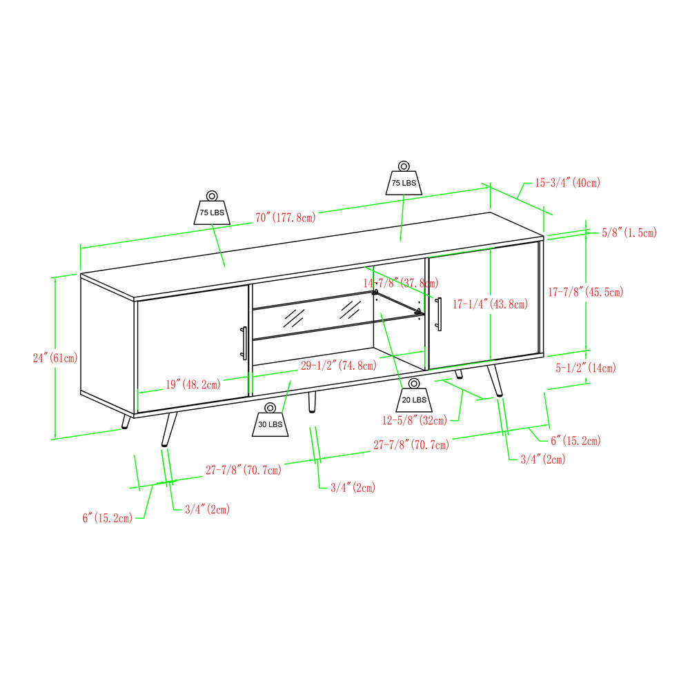 Mid-Century Modern 2 Door 70" TV Stand For 80" TVs With Glass Shelf - Birch 70.0"W x 15.75"D x 24.0"H - 81.0 lb