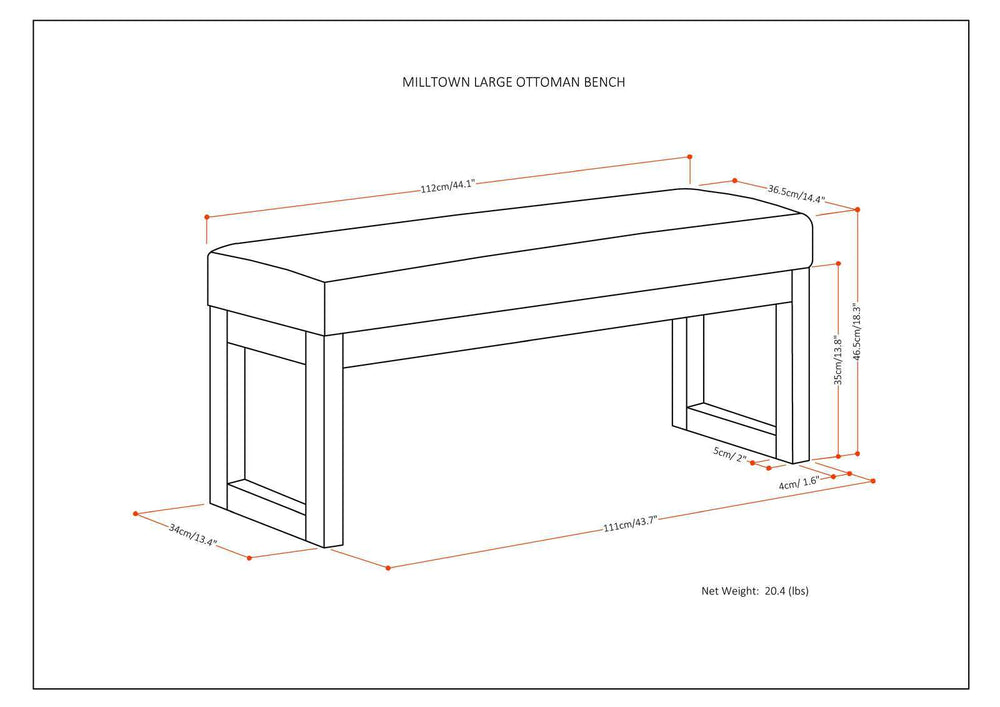 Milltown - Large Ottoman Bench - Mink Brown 44.5"W x 14.2"D x 18.3"H - 20.1 lb