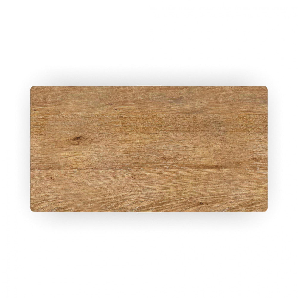 Sophistication meets rustic, industrial charm with the Millwork rectangular coffee table. Seamlessly blending high-contrast materials and finishes in perfect harmony, this table makes a captivating statement in any living space. A textured steel frame is highlighted by warm copper undertones, while a distinctive wood top and lower shelf exude character with natural knots, subtle saw marks and a white cerused finish that accentuates the rich umber wood grain.