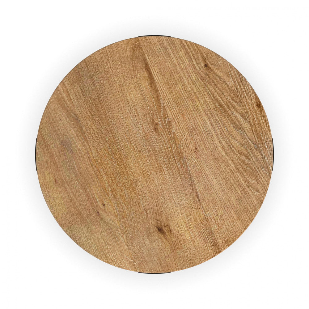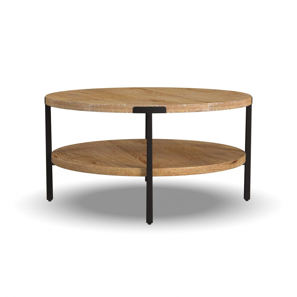 Sophistication meets rustic, industrial charm with the Millwork round coffee table. Seamlessly blending high-contrast materials and finishes in perfect harmony, this table makes a captivating statement in any living space. A textured steel frame is highlighted by warm copper undertones, while a distinctive wood top and lower shelf exude character with natural knots, subtle saw marks and a white cerused finish that accentuates the rich umber wood grain.