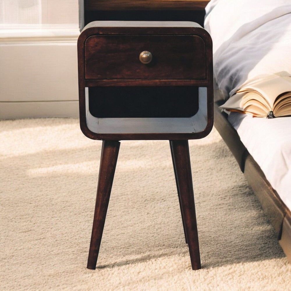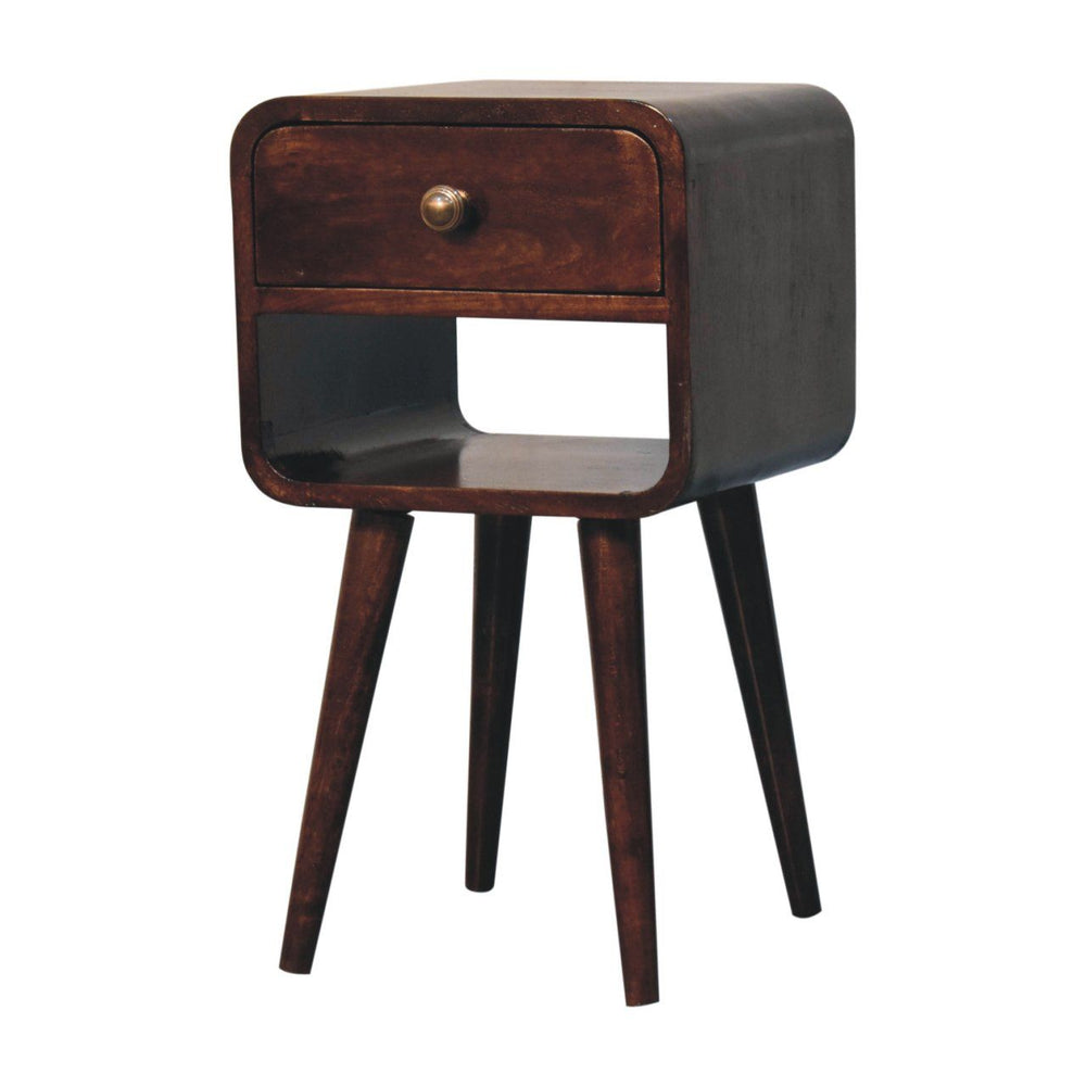 Artisan Furniture Solid Wood Mini Curved Bedside, 1 drawer - The mini version of our famous IN308, this small but handy bedside makes a perfect stand for nibbles, drinks, or a lamp. It will prove handy all over your home and is made from 100% solid mango wood in a fine finish. It has curved edges which will fit into any home/living space. It also comes with 1 drawer, 1 lower open slot and 4 Nordic style legs. This petite product is part of Recession Collection.