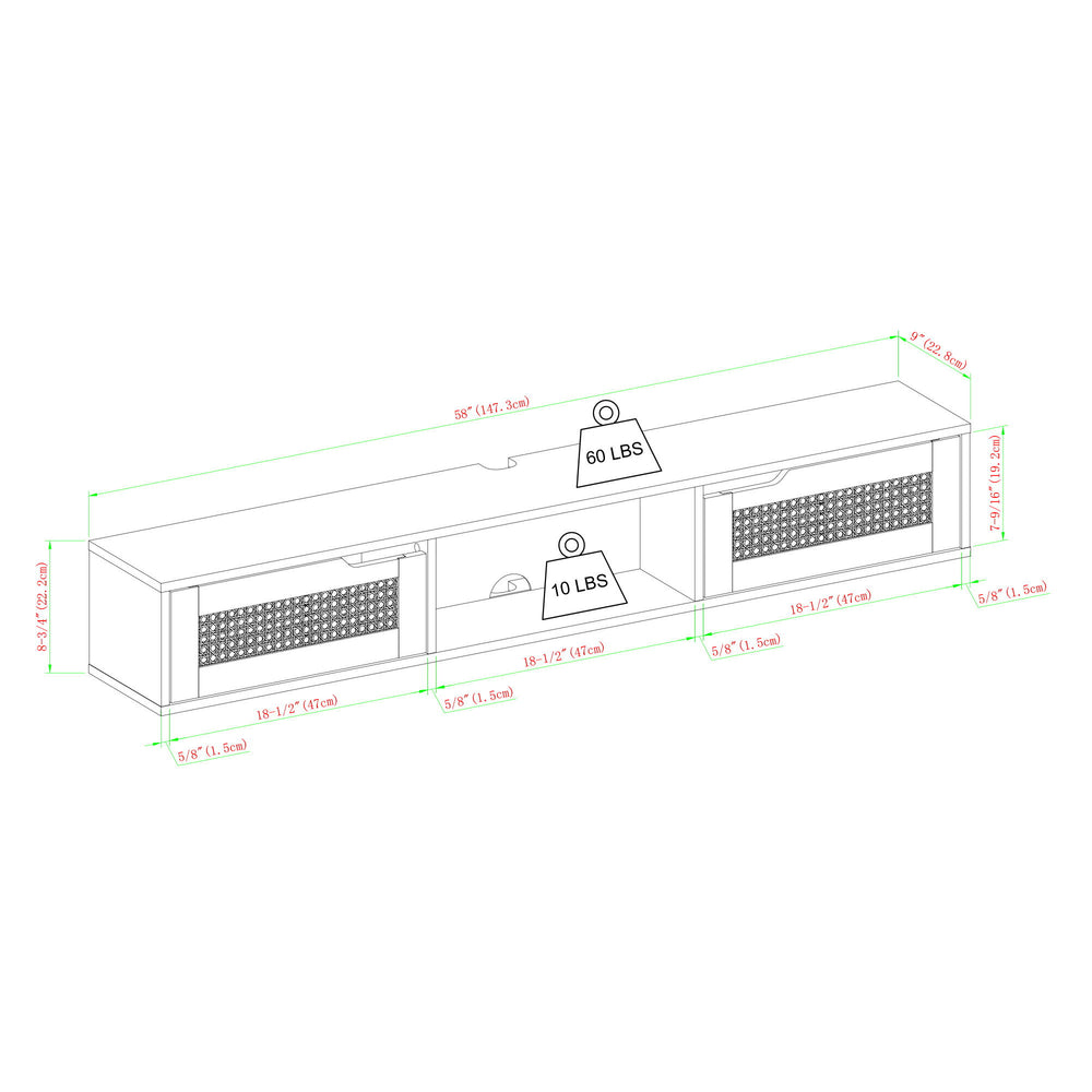 Modern Rattan Door Floating TV Stand For TVs Up To 65" - Black 58.0"W x 9.0"D x 8.75"H - 30.0 lb