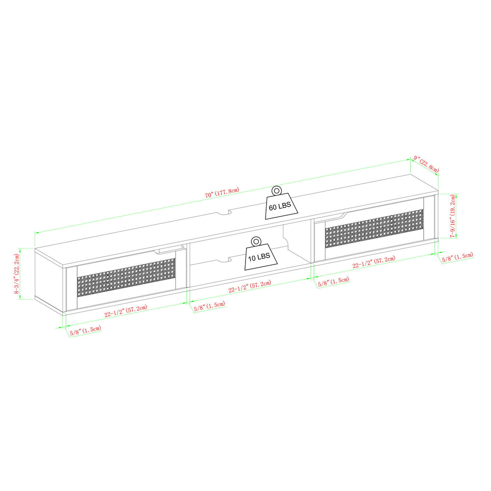 Modern Rattan Door Floating TV Stand For TVs Up To 80" - Coastal Oak 70.0"W x 9.0"D x 8.75"H - 36.0 lb