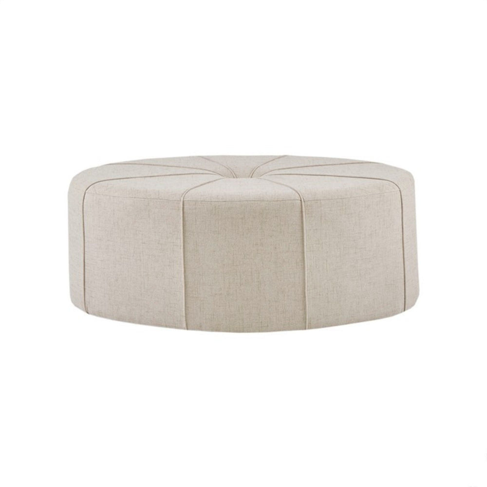 Lifestyle: This contemporary-style coffee table ottoman features a button-tufted center design and a solid fabric cover, complemented by thick welting.