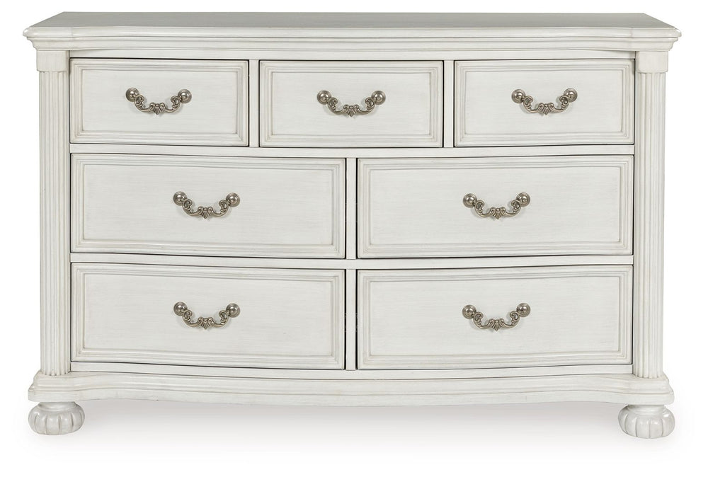 Transform your inner sanctum into a haven of timeless elegance and functionality. This traditionally styled dresser is adorned in a classic antiqued white finish, highlighted by a serpentine-shaped front with thick decorative moulding. Its drawers are packed with ample storage possibilities. And did we mention the stylish reeded bun feet? Talk about relaxed refinement.