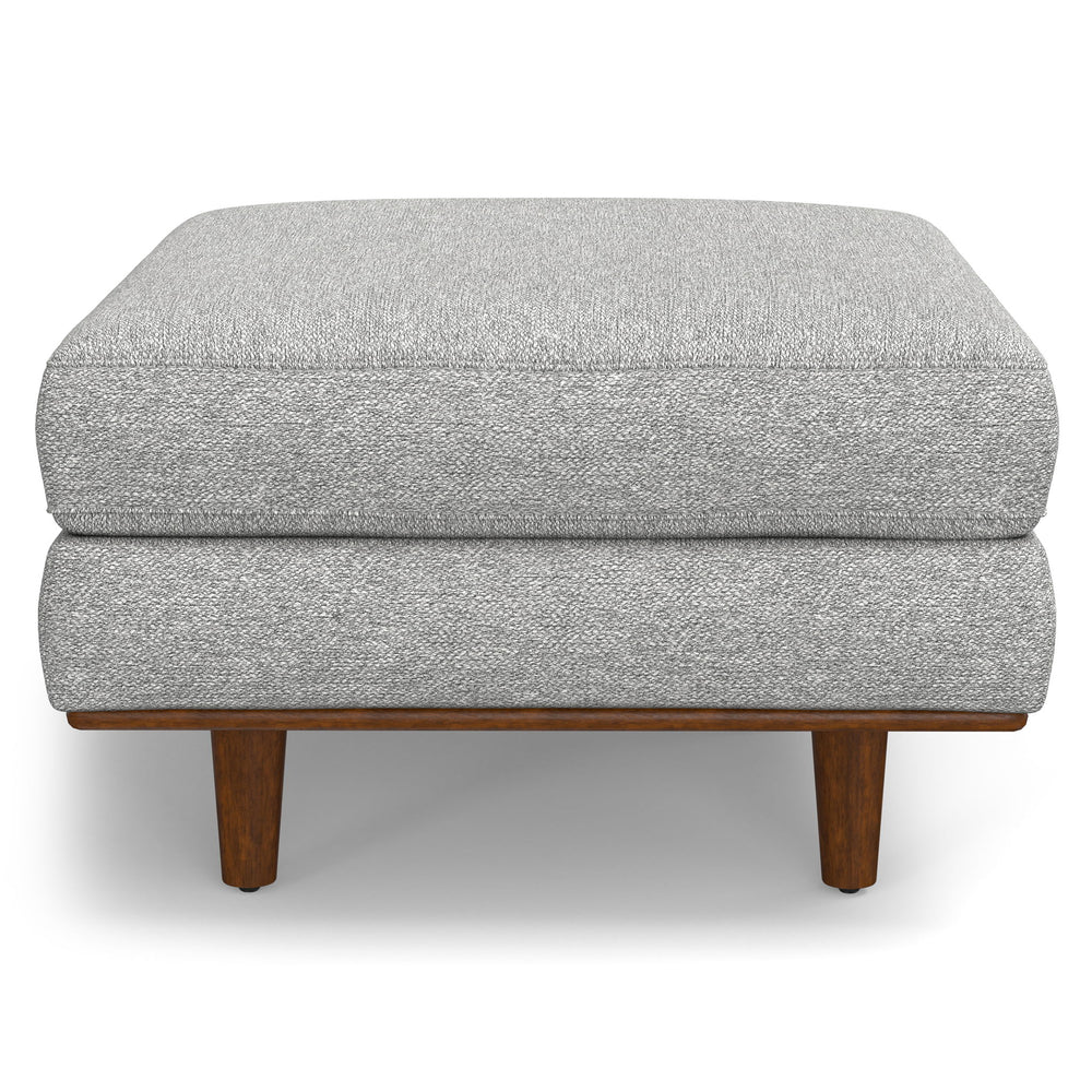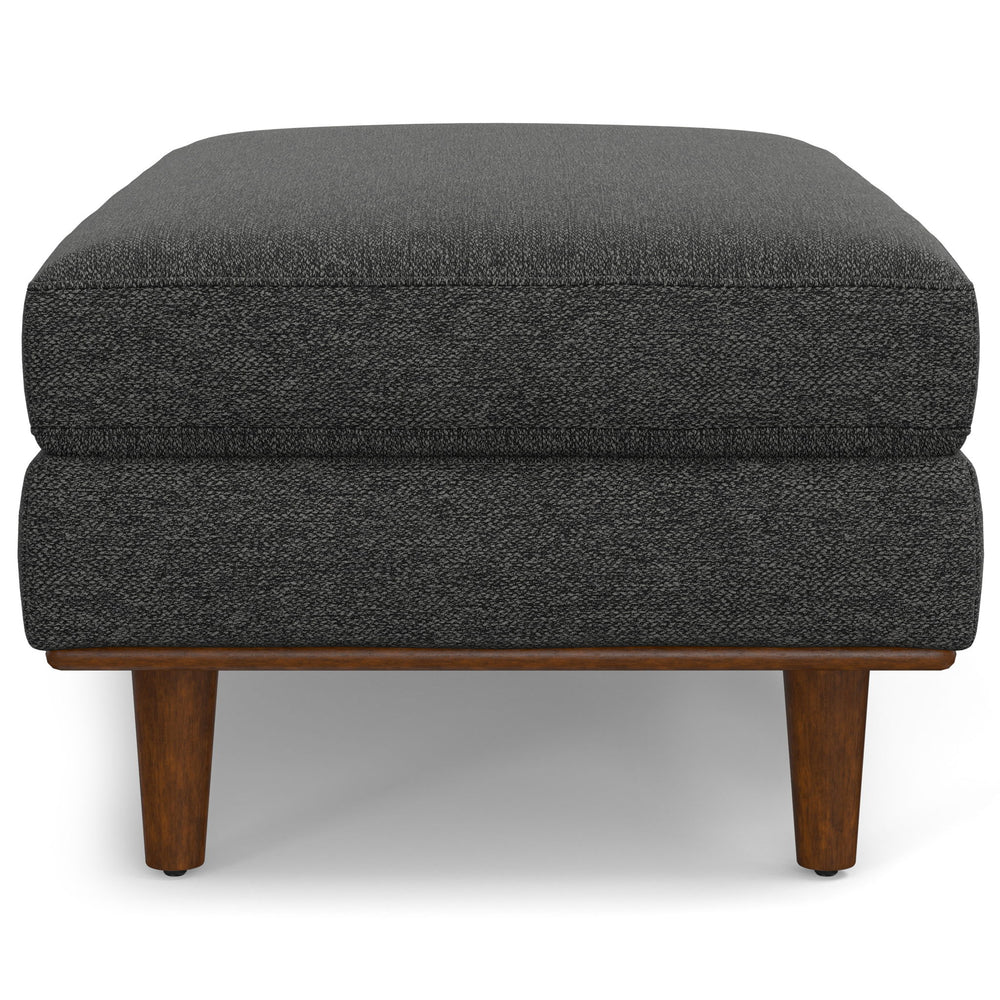 Handcrafted, multifunctional ottoman with mid-century modern styling can be used as a footrest and impromptu coffee table, or place it against one of the matching Morrison couches to convert the sofa into a flexible sectional; accommodates up to 300 lbs.