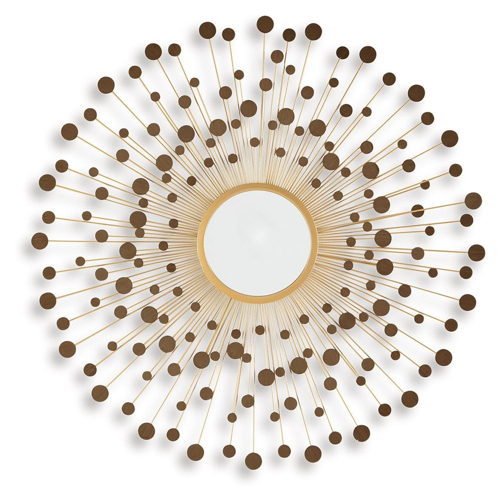 Light and bright, this accent mirror is a trendy take on wall decor. Its metallic spokes splay outward to create a sculpture-like frame. With goldtone and bronze-tone finishes, the piece is a reflection of your eye for contemporary design.