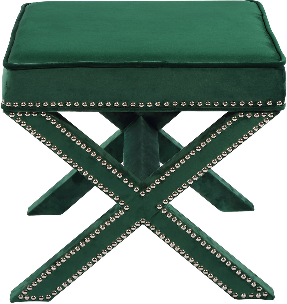 You'll be sitting pretty on this Nixon velvet ottoman/bench. This beautiful piece has a stunning look with its velvet upholstery and nail head trim that gives your room a decidedly contemporary vibe. The X-shaped legs are sturdy and stout, making it a beautifully durable addition to your space. The ottoman's large top accommodates your feet while you relax and unwind with a good book, or pull it out on game night for an extra seat.