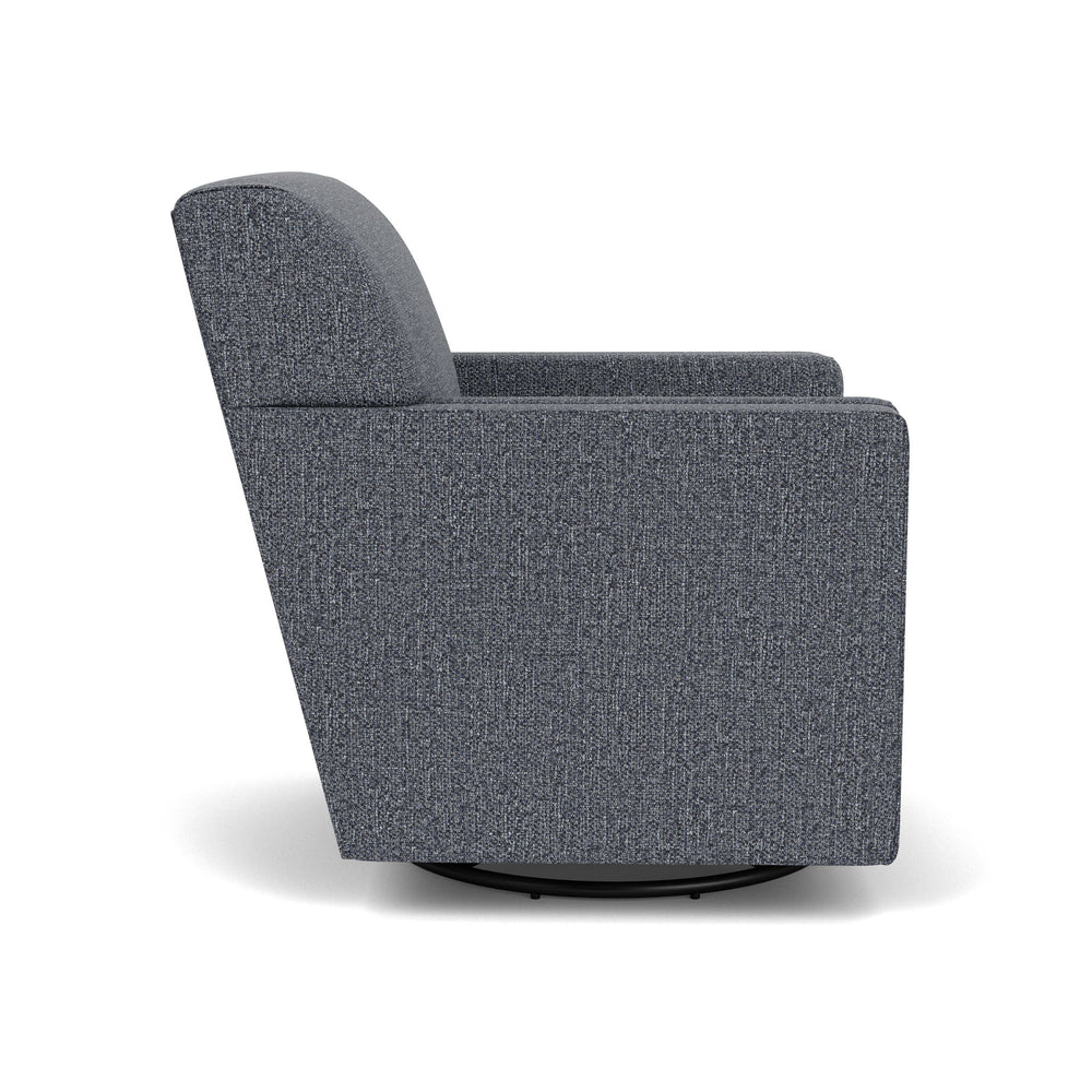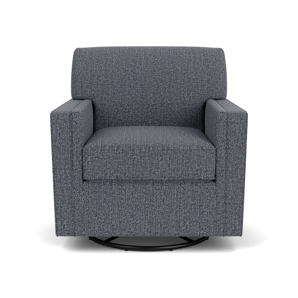 Relax in a perfectly proportioned chair that balances simple sophistication with lasting comfort. A tight back and soft, reversible box seat cushions provide firm yet comfortable support, while a swivel base allows the chair to turn a full 360 degrees. Simple, clean lines and refined welt detailing offer a clean and tailored silhouette for any size living space.