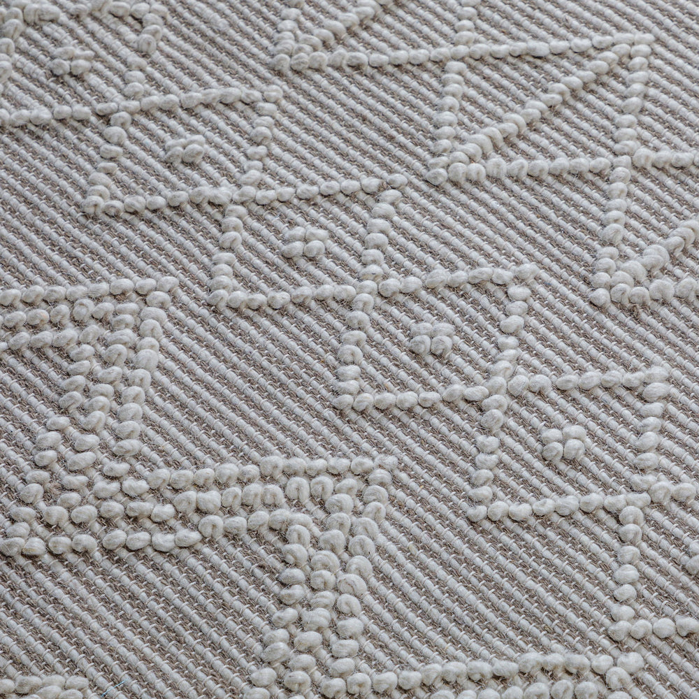 Detailed with a geometric pattern in ivory and taupe featuring a hand-knotted fringe