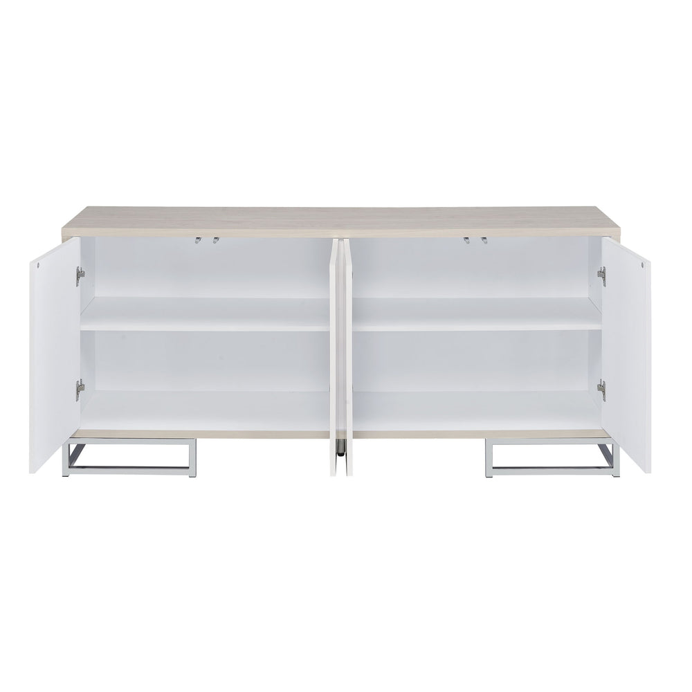 Versatile Design: This elegant console cabinet is offered in two distinct color styles: White Marble Paint with Oak & Champagne accents, and White Marble Paint with a sleek Chrome Finish, making it adaptable to various interior designs.