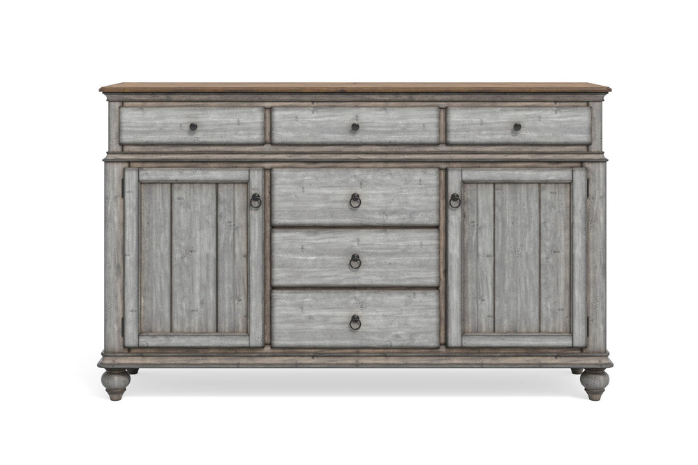 Entertain in relaxed cottage style with everything you need to host dinner guests with this Plymouth buffet. A weathered graywash finish is accented by a medium brown top and gunmetal pulls, while paneled details and turned bun feet add to the cozy vintage character. This buffet features two cabinet spaces with adjustable shelves and a removable wine rack that can store up to 16 bottles. Pair that with six spacious drawers—complete with felt-lined top drawers and a removable silverware tray—and you have ample storage for serving pieces and other dining essentials. Each drawer features ball-bearing glides for smooth access and support for heavy dining ware.