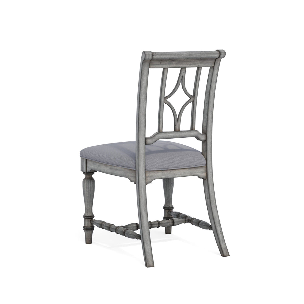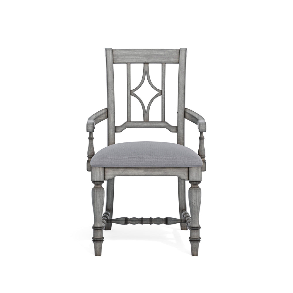 Shabby chic design with a bit of vintage. The Plymouth upholstered arm dining chair boasts a shabby chic design with an overall graywash finish. Accented by coordinating dark dining table and buffet tops, Plymouth is ideal for those who like a bit of vintage design in their modern lives. This chair features a panel back with a diamond-shaped detail, and is a perfect seating choice to complement the Plymouth rectangular dining table or round pedestal dining table.