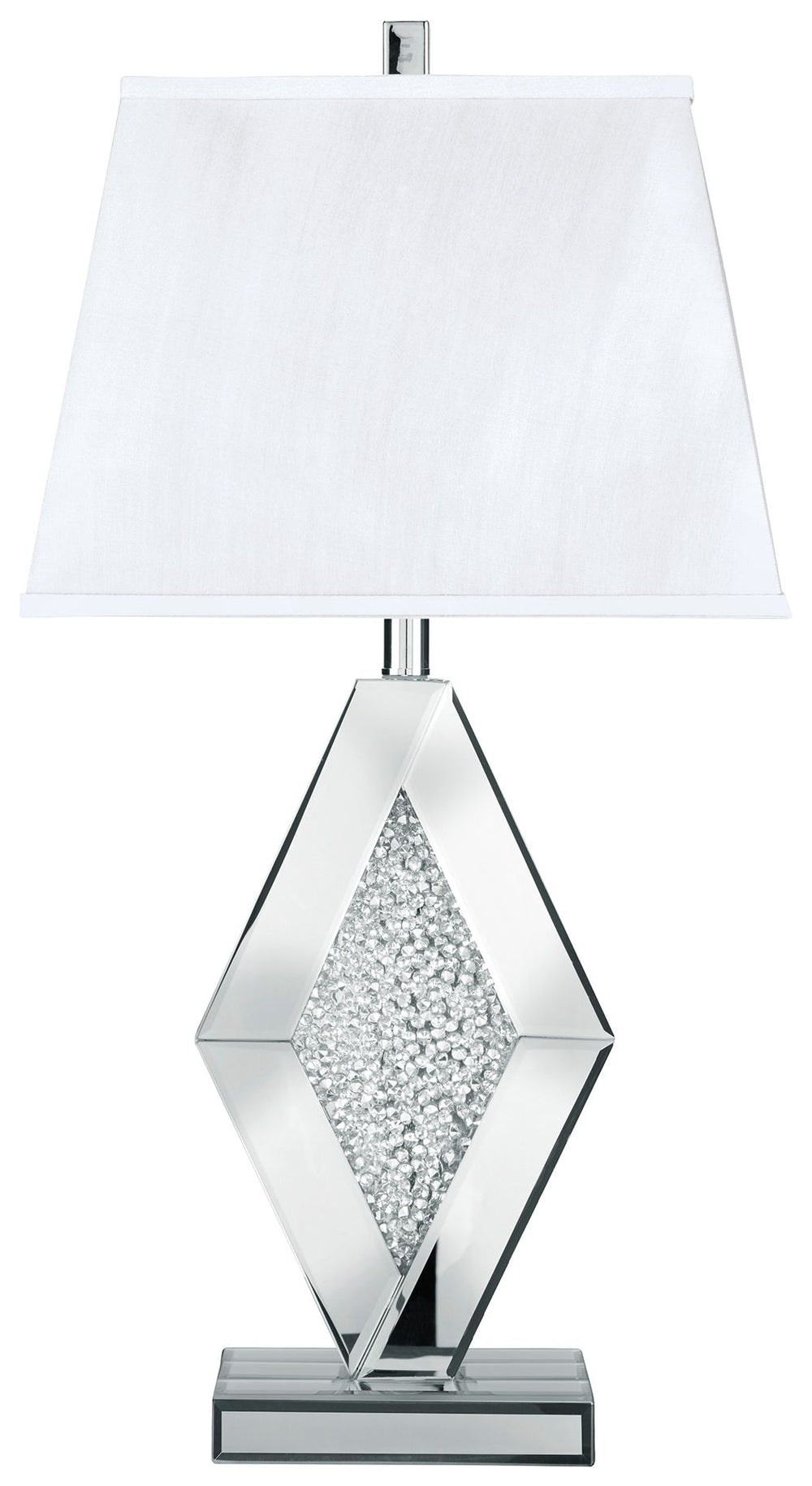 With an elegant array of mirrored glass and crystal beads, this table lamp adds a brilliant touch of wow to any setting. It's topped with a rectangular empire shade for an utterly luxe look.