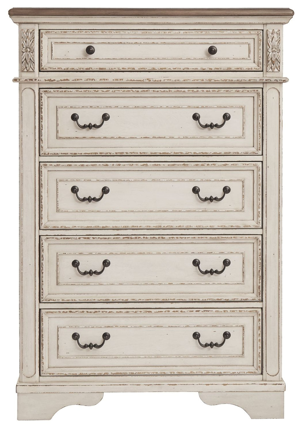 Elevating the art of traditional cottage styling, this chest of drawers is your dream bedroom retreat realized. Its antiqued two-tone aesthetic blends a chipped white with a distressed wood finished top for added charm. Framed drawer fronts and decorative corbels add refinement, while bail pulls in a dark bronze-tone finish lend a classic touch.