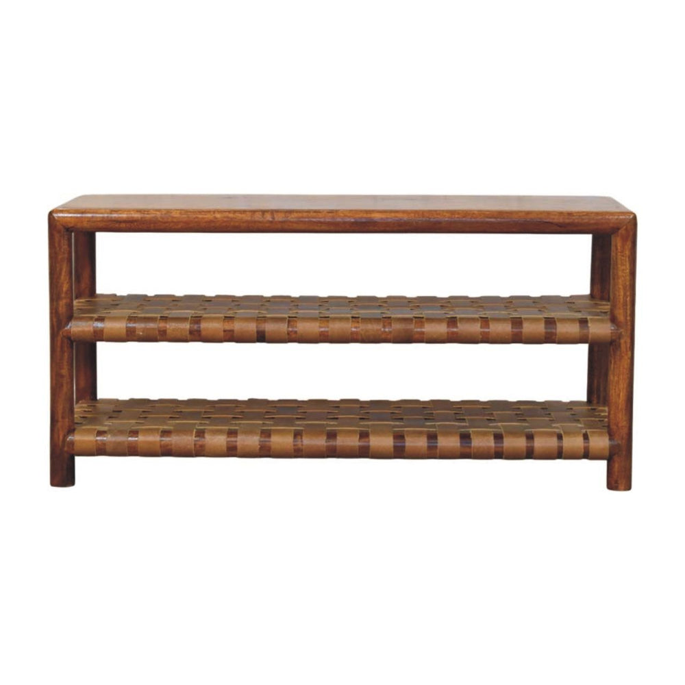 Shoe Rack Regency Woven Chestnut 2 slot Artisan Furniture - Introducing the Braided Shoe Rack, where timeless design meets everyday functionality. Crafted from 100% solid mango wood in a rich Chestnut finish, this piece features three open shelves with two slots made with intricately braided leather, adding a unique texture and rustic elegance. Perfect for organizing shoes, accessories, or household essentials, its sturdy frame ensures lasting durability. The clean lines and warm tones make the Braided Shoe Rack a versatile and stylish storage solution that enhances the charm of any entryway, hallway, or living space.