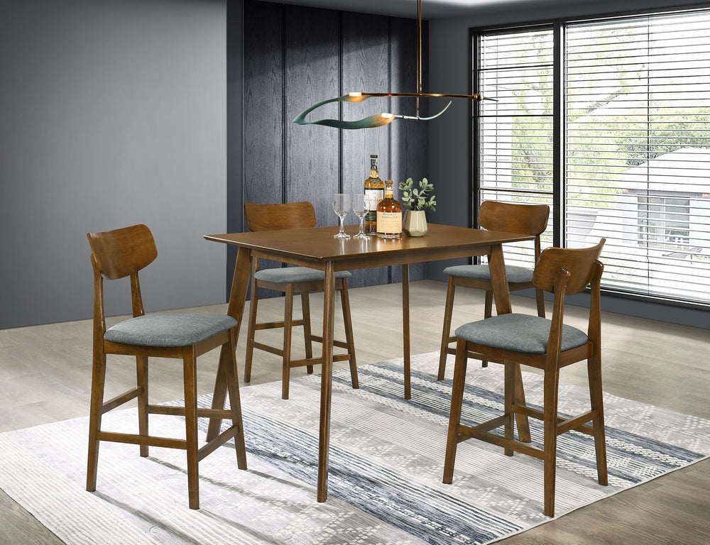 Create a warm and inviting breakfast nook with this charming five-piece modern counter height dining set. Centering on a 47-inch table, it boasts a rich walnut finish that lends timeless character and style. The table boasts angled fin-style legs that add dimension and character. Counter chairs offer plush comfort with foam-padded seats covered in inviting gray upholstery. Curved backrests and built-in footrests complete the design and offer incredible comfort, perfect for quick bites and leisurely dining.
