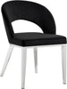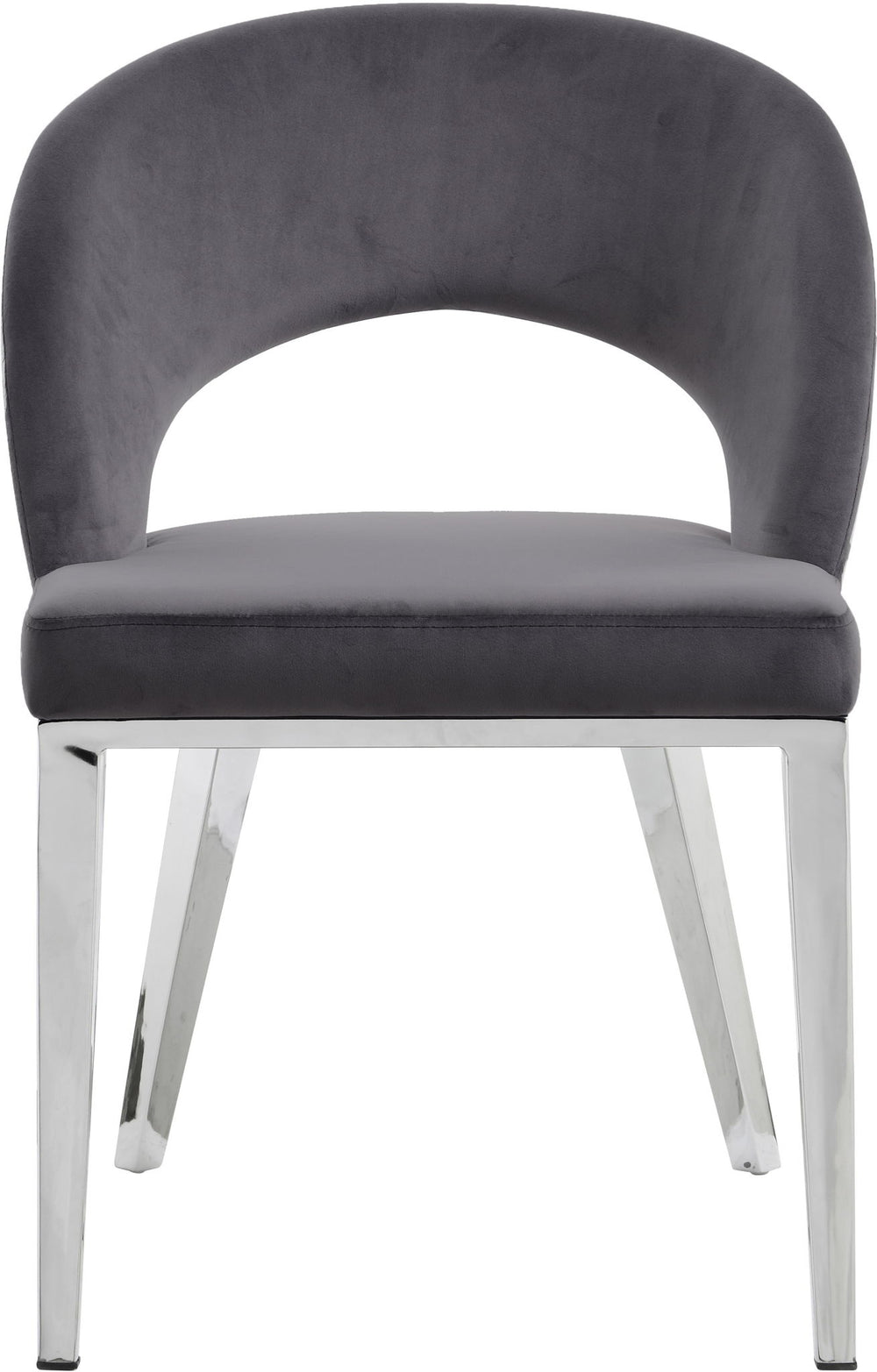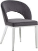 Seat dinner guests in elegant style with the Roberto velvet dining chair from Meridian Furniture. This fabulous chair features a rounded back with strategically placed opening for visual beauty and to allow air flow while you dine. The rich upholstery is chic and modern, and it has a soft feel against the skin. This chair rests on iron legs for superb support, and each leg is finished in for a modish slant that meshes well with your up-to-the-minute dining room decor.