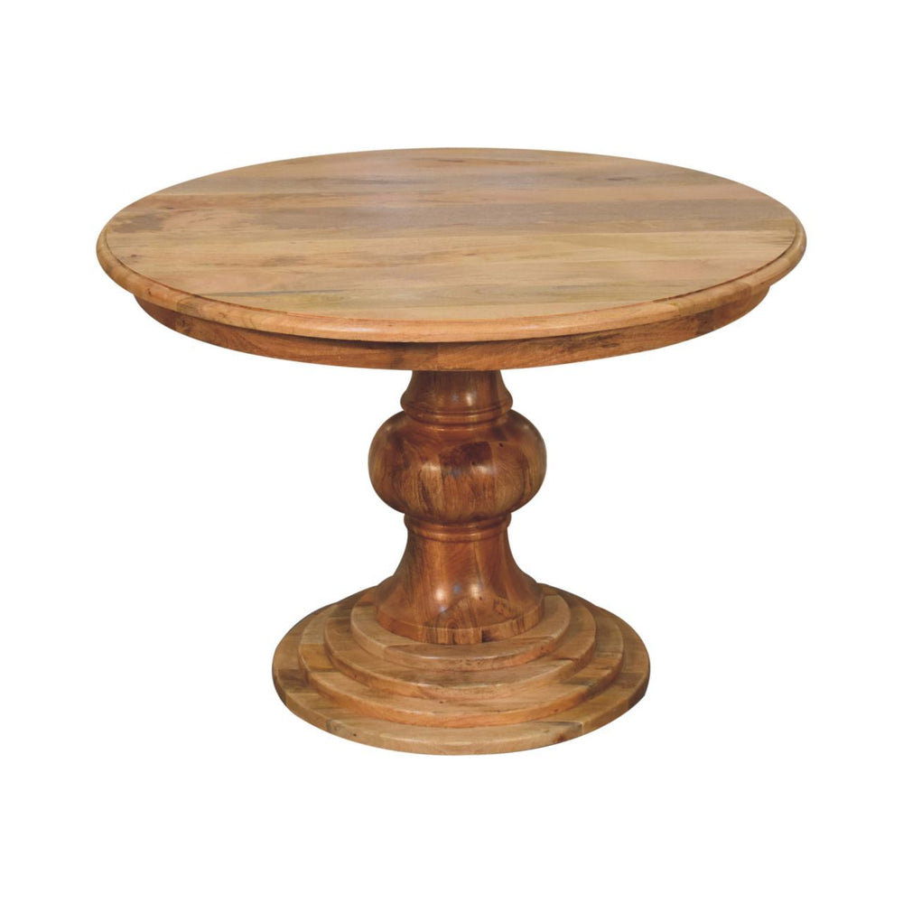 Round Turned Dining Table - Create an elegant dining experience with this Round Turned Dining Table. Drawing inspiration from a classic French design it combines graceful curves with warm wood tones. Crafted from solid mango wood with an oak-ish finish this round table is the perfect piece for any dining room or kitchen. Every piece of furniture is individually handcrafted and includes swing care tickets explaining the cautions and aftercare instructions.